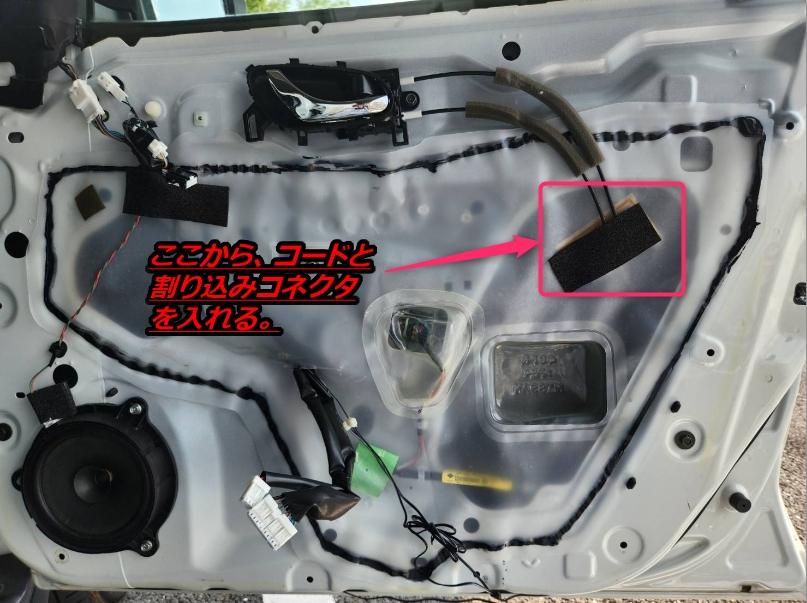 このビニールにて覆われて防水されている周りのネチッとしたコム状の糊みたいな部分からオールオート化の接続するコネクタとドア開閉のワイヤーがビニール内に入っていく部分から割り込みコネクタを入れます。