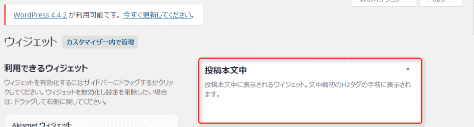 管理画面の中に記事中ウィジェットという項目が追加されます。