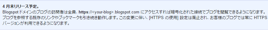 Blogspot ドメインのブログの訪問者は全員、https://<your-blog>.blogspot.com にアクセスすれば暗号化された接続でブログを閲覧できるようになります。ブログを参照する既存のリンクやブックマークも引き続き動作します。この変更に伴い、[HTTPS の使用]